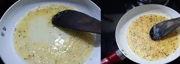 2.将黄油倒进热锅里,稍微融化后加入切碎的大蒜和红辣椒,翻炒匀。