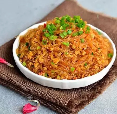 材料:植物油150克,粉丝200克,肉沫80克,葱、姜、蒜瓣20克,豆瓣酱30克,汤150克,干辣椒30克