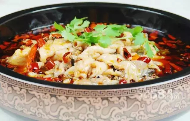 7.将锅清洗干净,然后倒入少许油烧至7成热,放入另一半花椒和干辣椒爆香,倒在煮好的酸菜鱼上,放上2根香菜即可。