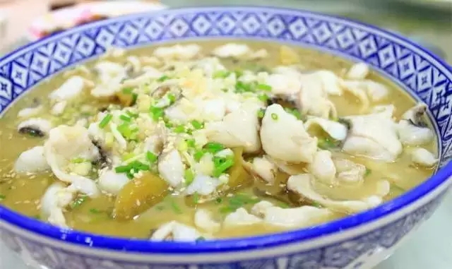 6.轻轻地倒下鱼片烫熟后即可熄火将煮好的酸菜鱼倒入一个大碗或砂锅内。