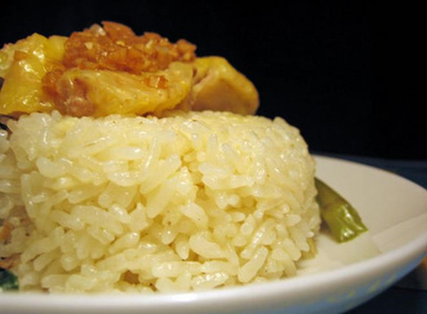 清香的米饭,拌上煮鸡肉的浮油,用汤匙拨一拨那吸收了鸡油鸡汤的饱满饭粒, 即使凉了仍是粒粒晶莹不相黏, 饭粒松而不乾, 润而不油, 盛在碗里会松开但不会结团块。原以为淋上鸡油的饭粒会很油腻,但事实却是更耐嚼,糯软中带些嚼劲,这真是一种令人极为享受的口感 。