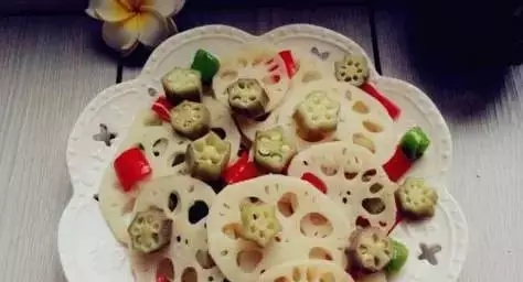材料:莲藕2根(九孔)、秋葵2根、胡萝卜半根、葵花子油、盐巴、生抽、鸡精各适量。