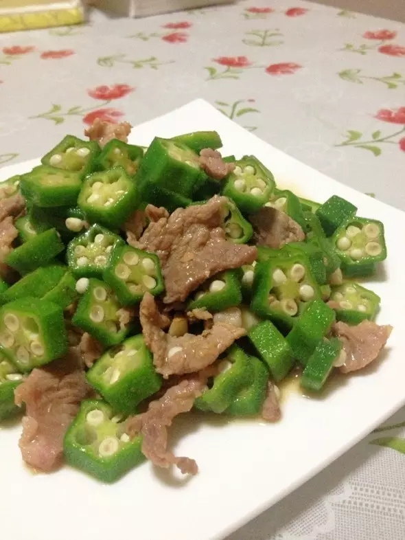 3.锅热倒入肉片翻炒,肉片炒香后放入黄秋葵继续炒;