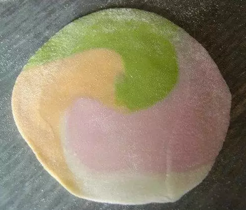 3把小面团擀好,就变成了这样的“八卦图”面皮: