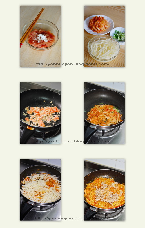 6. 放入土豆丝翻炒,下入韩式辣椒酱和糖、盐调味料拌炒入味,(这时候再把韩式辣白菜的泡菜汤汁也倒一点进去会更加有味)