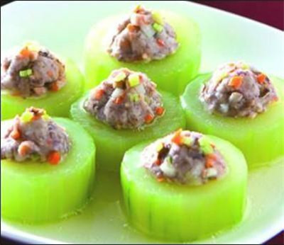 4. 将作法3填好馅的大黄瓜放在蒸盘上,放入蒸锅蒸约25分钟,再焖约2分钟后取出,摆上洗净的香菜叶即可。