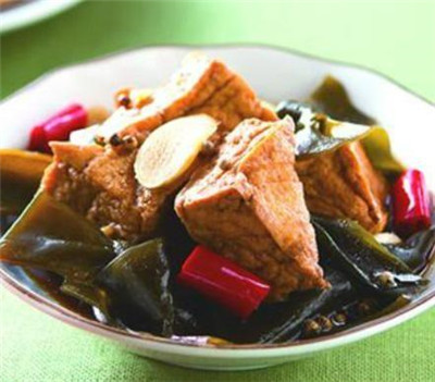 3.续于作法2中加入调味料、作法1的海带结和油豆腐主治滚沸,改转小火卤约15分钟即可。