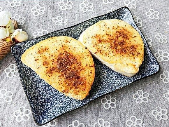 3、一边煎至微微发黄即翻面,发黄这边的馒头片上均匀撒上孜然粉,再翻面再撒,撒上之后让稍稍煎一下,使两边撒上孜然粉后都煎制一下。按个人口味调入盐、熟白芝麻、葱花,颠匀盛出。