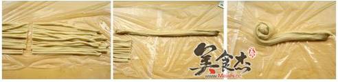 4.将抻好面分成两块,分别擀成方形,饧五分钟
