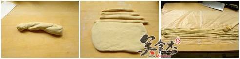6.将拉长的面条切成三份,在把每份握在一起拉长,卷起,可从一边卷到另一边,也可以对卷,在中间放点枣泥,豆沙之类的馅,扣起来,压扁。饧十五分钟