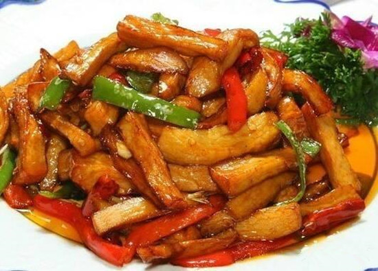 用料:茄子2条、肉丝、姜、蒜、葱、豆瓣醬、醋、糖