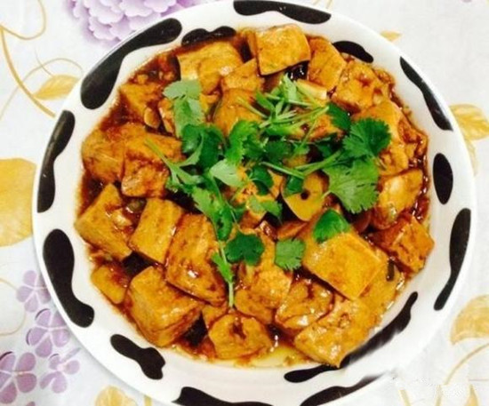 3、葱姜蒜炝锅,炒出香味,倒入豆腐,翻炒几下,加入酱汁,略炖一下后,勾芡出锅,然后撒香菜或葱花即可