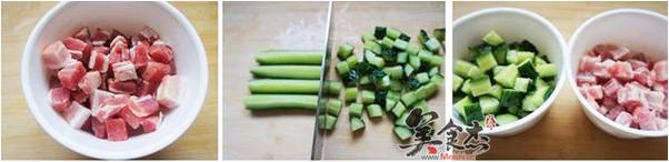 黄瓜丁放碗中,加入少许盐拌匀。肉丁加入盐,蛋清,淀粉抓匀