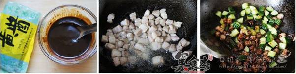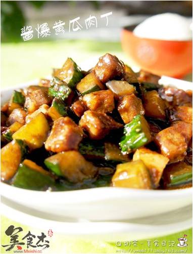 炒锅内留底油,油热放葱姜爆香,下黄酱翻搅均匀,加白糖溶化,烹入料酒,最后倒入肉丁、黄瓜丁快速翻炒至酱汁收浓,调入味精出锅。
