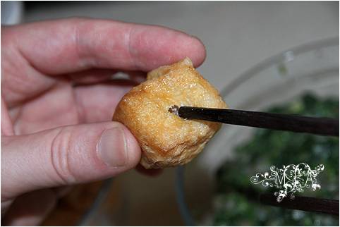 1. 用筷子将油豆腐扎一个小口,插入筷子轻轻搅动一下,使油豆腐内部空间变大。