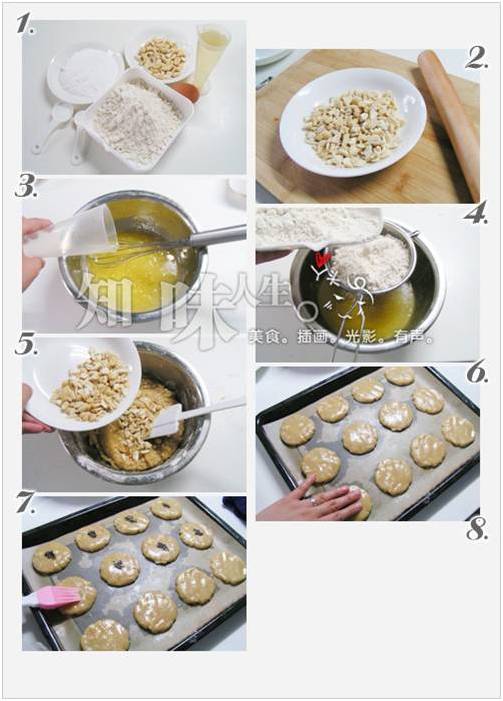 P1:材料:油100ml,低筋面粉200g,糖80g,鸡蛋1个,泡打粉(注)1小勺,盐1又1/2小勺,腰果适量。
