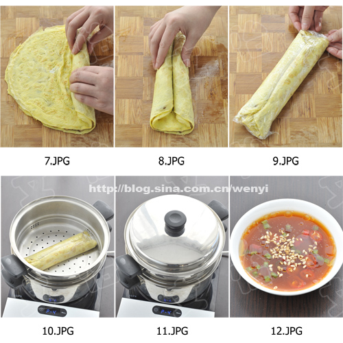 **在蛋卷上锅前,要用能耐高温的保鲜膜包裹以便成型。就买超市中,微波炉耐热保鲜膜就可以啦。