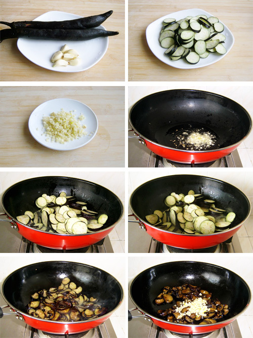 5、炒至茄子熟透,用旺火收浓汤汁,放入余下2/3蒜末和鸡精,翻匀出锅即可。