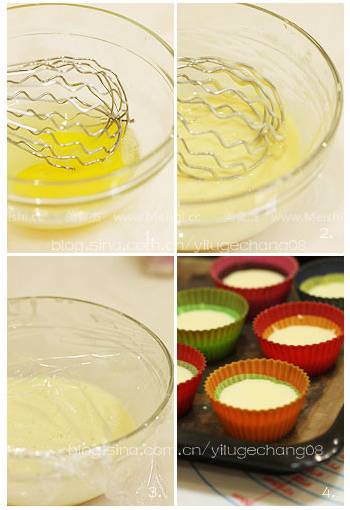 原料:a、鸡蛋50克,白砂糖35克,盐1/4小匙。 b、低筋面粉45克,奶粉1小匙,泡打粉1/2小匙 。c、牛奶25克,沙拉油10克,香草精1/2小匙