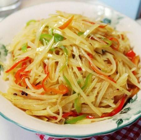 1、将土豆切成丝,放入盆中加入水泡泡;