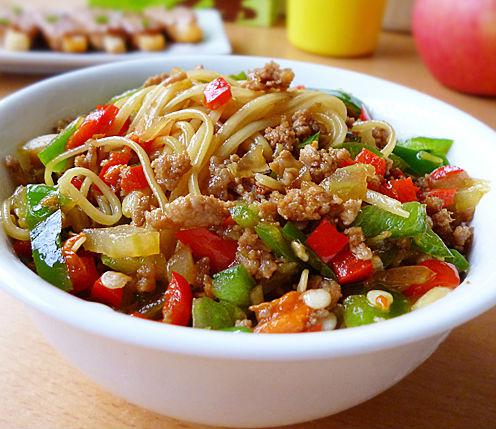 1、猪肉剁成沫,青红椒切丁,芹菜切丁;