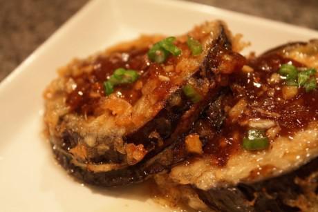 3、平底锅烧热,倒入油,将茄子片裹上面糊,放入锅里,煎至两面金黄,茄子瓤熟软即可出锅;