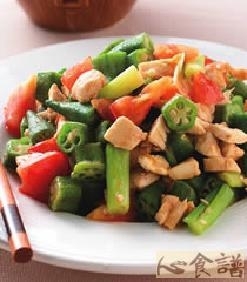 1.秋葵对半切开,用开水焯5分钟取出,鸡肉用热油煸熟备用,小番茄对半切开备用。