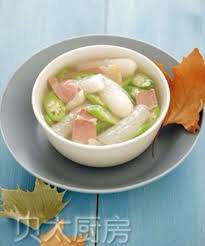 2 锅加鸡汤和水,把火腿烧开去沫,煮30分钟后加竹荪煮10分钟,加秋葵煮3分钟,调味。