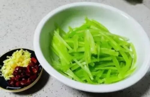 第一步:先将莴笋去叶刮皮,再改刀切丝,在切丝时,不用切得太细,也可以用工具擦成丝,接着在清洗一遍,沥干水分。大蒜切末,干辣椒切段,备用。
