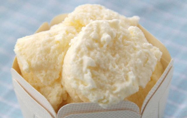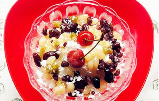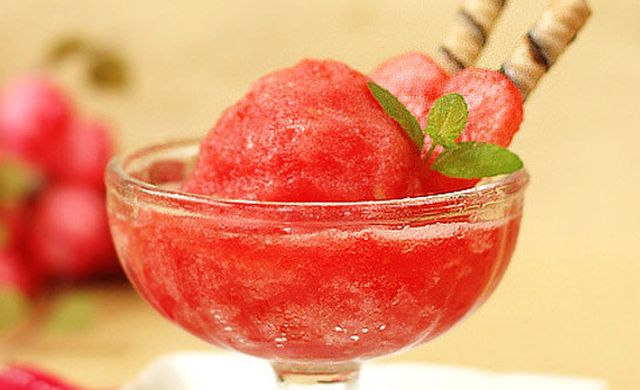 2.等几小时酸奶冻成冰后用勺子或挖球器刮成碎冰,或是稍微回温变软,挖成球状盛入容器