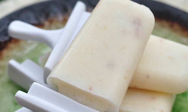 4.将冷藏好的荔枝酸奶浆倒入雪糕机8-9分满,插入雪糕棒