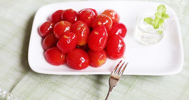 5.用白糖腌制后的圣女果会渗出不少汤汁,拌入蜂蜜和桂花之前把汤汁倒出