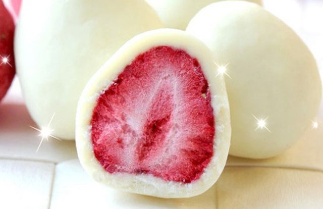 把草莓泡进酸奶里,然后放进冰箱冷冻,就成了清新可人的酸奶草莓球!