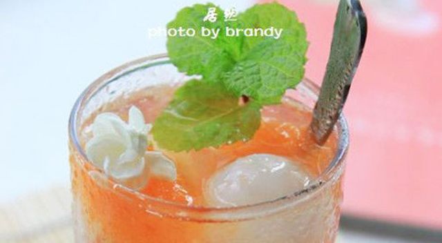 3.取出果汁冰格,倒入玻璃杯,剥曲荔枝壳,荔枝白肉放入杯,倒入冷藏过的雪碧,插入薄荷茶,点缀茉莉花即可
