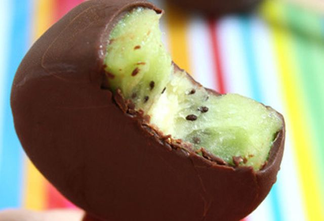 猕猴桃切片,蘸满巧克力酱,放进冰箱冷冻至巧克力凝固,然后,尽情享受美味吧!