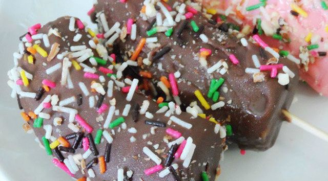 裹上一层巧克力酱、蘸上些果仁碎再冻一会儿,就是真正的水果冰棍儿了!