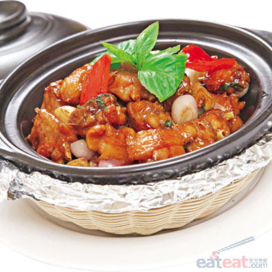 制作 将鸡翅剁成长约2.5厘米的段,用盐、米酒、粘米粉腌至入味.净锅入油,油温升至四成热,放入腌好的鸡翅炸至断生,出锅控油.锅留底油,将蒜子、姜片、干葱煸至出味,放入鸡翅,调入蚝油、三杯汁、金不换叶2克、红椒片翻匀出锅用金不换叶1克装饰即可。