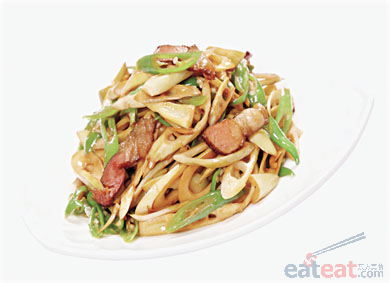 原料 神农架野山笋350克,杭椒片25克,腊肉片40克。