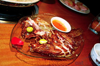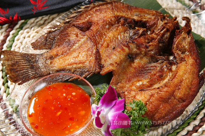 锅内入油,烧至六成热时下入罗非鱼炸至深红色,捞出控油,装盘用青、红椒圈装饰,食用时挤青橘汁,淋泰国辣椒酱即可。