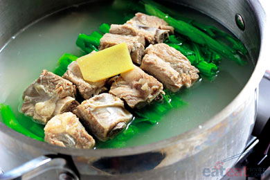 制作 猪肉排洗净,切成长5厘米的段,加入A料抓拌均匀,腌制24小时.春菜洗净,切成长12厘米的段,焯水.肉排略微冲洗,放入锅内,倒入纯净水1500克、姜片大火烧开,改小火加热至肉排成熟,放入春菜,用盐调味,中火烧2-3分钟,离火装盘。