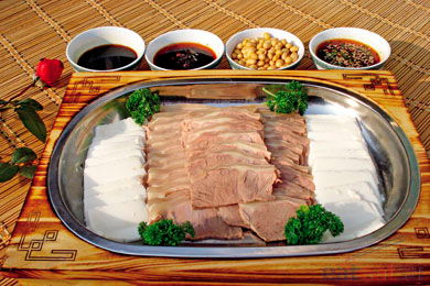 制作 生驴肉洗净,用清水冲漂3小时,捞出放入冷水锅内,加入A料,大火烧开,改小火加热30分钟,关火再焖制10分钟,捞出驴肉,控水后放入不锈钢盆内,用重物压实,客人来时,取驴肉切成厚0.3厘米的大薄片,放入容器中间.内酯豆腐取出,切成厚0.3厘米的片,摆放在驴肉片的两侧,入蒸箱大火蒸热,取出后搭配茄汁黄豆、秘制酱、蒸鱼汁、脆椒酱四种味料上桌。菜肴上桌后,根据客人自己的喜好,酌量倒入味料食用。