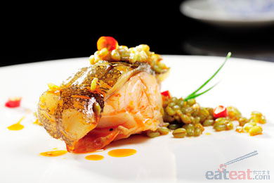 制作 海参斑洗净,放入自制汤料,入蒸箱大火蒸15分钟,捞出放入盘中.青麦仁加水蒸熟,控干水分后加入剩余调料调味,放在海参斑上。