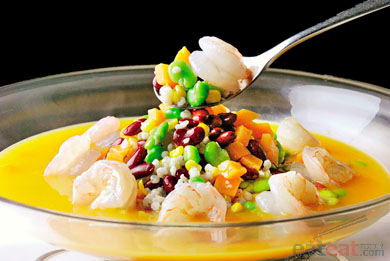 用料 大青虾仁10个,高粱米150克,罐装红腰豆500克,鲜玉米粒250克,嫩蚕豆100克,胡萝卜丁30克,腌料(盐3克,味精5克,只腌制,不上浆),鸡汤300克,金瓜汁25克,盐、鸡粉各3克,湿淀粉10克,炼香的鸡油5克,色拉油20克。
