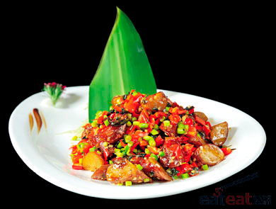 脆椒酱 将黄飞红香脆椒60克剁碎,放入碗内,倒入炒熟的白芝麻5克调匀。锅内放入花生油20克,烧至八成热时,出锅浇在香脆椒上,再撒入葱花3克调匀即可。