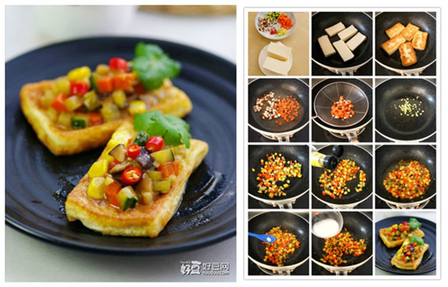 做法:1)客家豆腐洗净、切厚片,黄瓜、胡萝卜、香菇切丁,葱、姜、小辣椒切碎;2)锅烧热,加少许油,摇匀,豆腐片下锅,小火煎;3)煎至一面金黄,翻 面,煎至两面金黄,盛出待用;4)锅中烧水,水开后放入香菇丁和胡萝卜丁焯烫一下;5)约一分钟后,捞出沥干水分;6)另起锅烧热,加入少许油,油热后放 入葱姜末爆香;7)放入胡萝卜丁、黄瓜丁、香菇丁和玉米粒煸炒;8)调入少许酱油;9)再加入少许水,小火烧;10)烧至水分半干时,调入少许糖;11) 生粉调成水淀粉,勾薄芡,炒匀后起锅,浇在煎好的豆腐上即可。