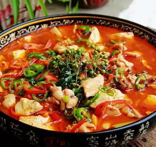 做法:1)鸡翅四个洗净,分割后留鸡翅根备用。2)嫩豆腐一块,静置出水后备用。3)大葱、青红辣椒洗净备用。4)大蒜、姜汁和火锅底料备用。5)鸡翅根剁 小块备用。6)剁好的鸡翅根装入调料盆,加入适量的食盐、白酒、十三香、蚝油、淀粉,然后,再放入一个鸡蛋清腌制起来。7)豆腐用手掰块备用。8)将掰好 的豆腐块,放入小锅中,加入清水煮开,去除异味,用清水泡起来备用。9)青花椒,用水洗净备用。10)将大葱切段,小一些的葱切葱花青红辣椒分别切丝备 用。11)炒锅放油,下入青花椒炸香。12)然后放入火锅底料超香,然后放入大蒜和大葱段翻炒。13)下入腌制好的鸡肉块,翻炒。14)加入姜汁和少许酱 油,翻炒断生。15)加入适量的清水或者高汤,然后放入焯水的豆腐。16)豆腐放入锅中后,盖上锅盖,煮20分钟。17)将煮好的鸡肉好豆腐,倒入装菜的 食器里。18)另取一锅,放入食用油,下入青花椒炸花椒油。19)再放入葱花,炸香出葱油。20)放入青红辣椒丝翻炒断生。21)将炸好的复合油,浇在盛 好的菜盆里,即可上桌食用。