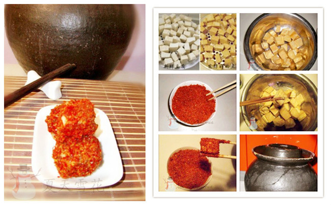 做法:1)做霉豆腐第一件事就是买豆腐,豆腐买好后,切方块,大小自选,放在篦子上盖上纸盒子,下面用盆接上(滤水份用)放在暖气旁边,过一个星期左右就发 霉了,看到完全变成如图“发酵好的豆腐”那样就可以了。完成这一步就可以准备东西开始做了。2)所有调料准备好,将发酵好的豆腐放入一盆内;3)将所有调 料放入碗内搅拌均匀;4)将高度白酒倒入装着豆腐的盆内,将所有的豆腐过一遍高度白酒,让豆腐块洗个澡;5)将沾过白酒的豆腐均匀的沾上3中的调料;6) 放入瓦坛子中即可
