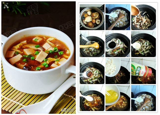 做法:1)鲜香菇洗净开水煮上2分钟,沥干水分。2)豆腐切小粒淡盐水浸泡10分钟。3)锅中加入橄榄油爆香葱姜,倒入切丝的香菇翻炒。4)加入适量的开 水。5)加入生抽。6)加入香醋。7)加少许的糖。8)加入油辣椒。9)煮上3分钟后加入豆腐10)加入胡椒粉。11)加入适量的盐。12)加入水淀粉勾 芡。13)倒入蛋液搅匀。14)最后加少许鸡精淋入香油关火。