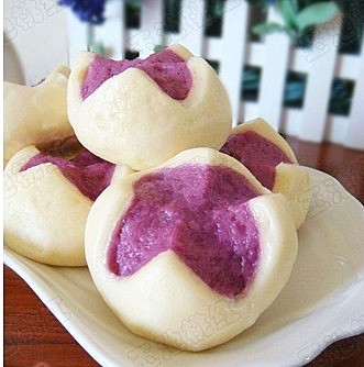 2.酵母放在水里化开,面粉加入少许盐和适量糖。面粉分成三份。一份和成白面,另外两份分别加入紫薯泥和南瓜泥,和成紫色面和黄色面两份。