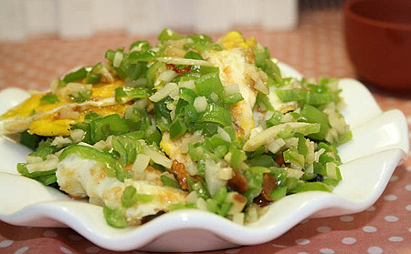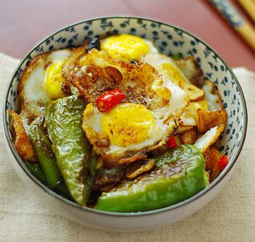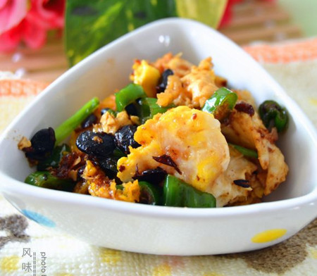 做 法:1)辣椒去籽切碎,大蒜子去皮切成末2)子姜切成姜末3)平底锅放入少许油,煎荷包蛋4)两面煎黄5)用锅铲划成小块,起锅6)炒锅中热油爆香豆豉、 辣椒、蒜末7)放入子姜末8)加少许食盐9)将荷包蛋片放入菜锅同炒10)加半勺黄豆酱11)加少许开水12)翻炒均匀后焖片刻即可出锅